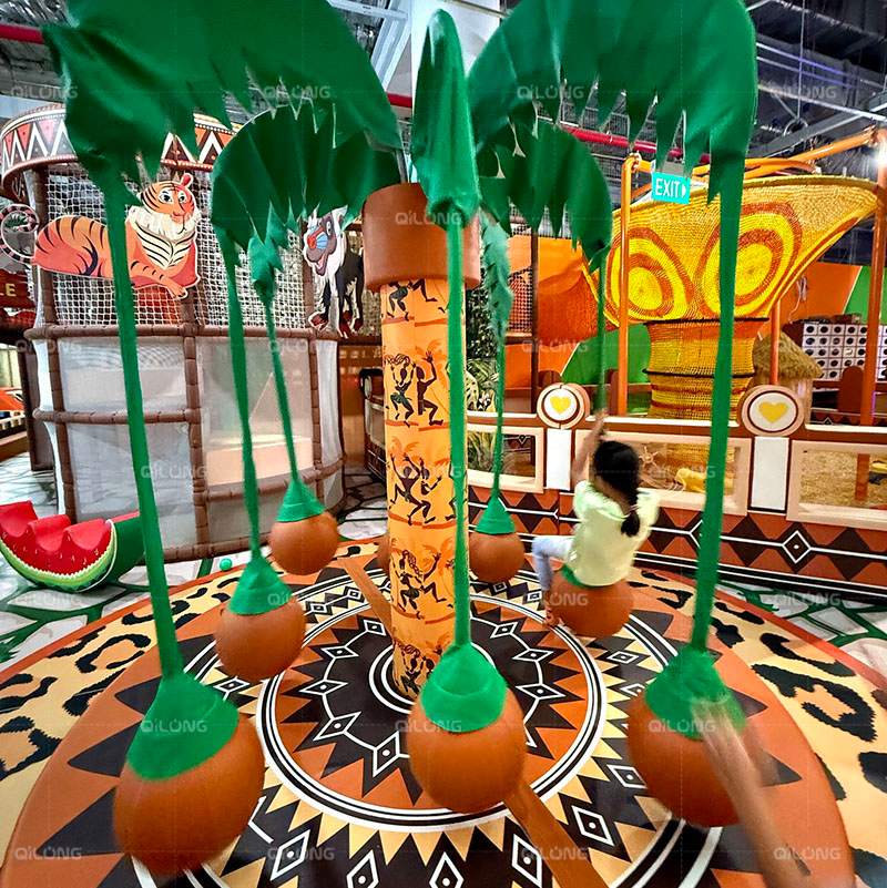 Una zona de juegos original centrada en una columna adornada con figuras de estilo tribal. Alrededor de la columna hay asientos de coco suspendidos de hojas de tela verde. El suelo luce intrincados patrones geométricos. Murales de animales (como un tigre) y otros elementos de juego realzan el ambiente lúdico.