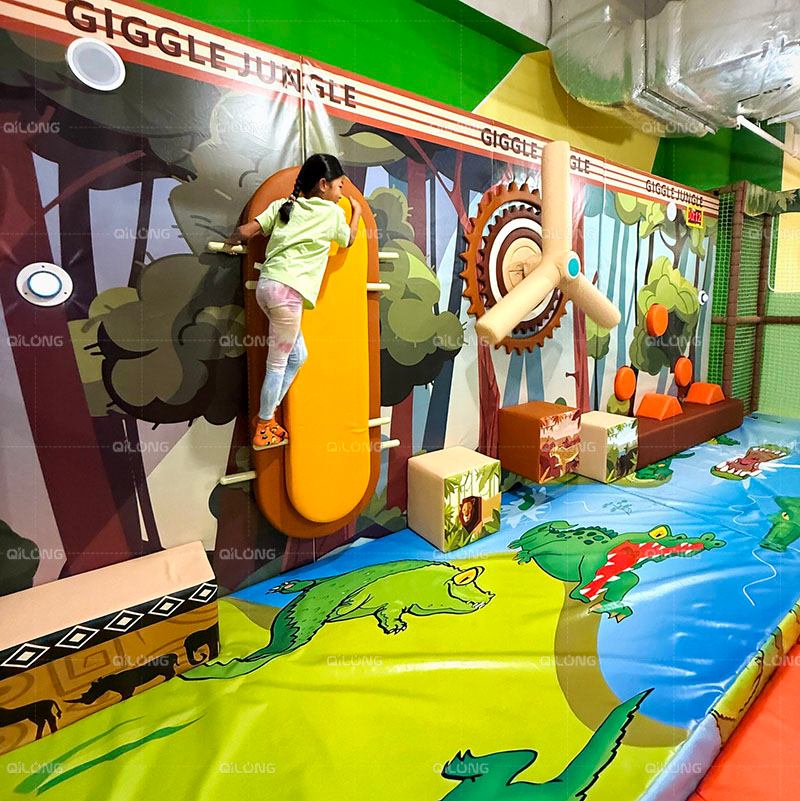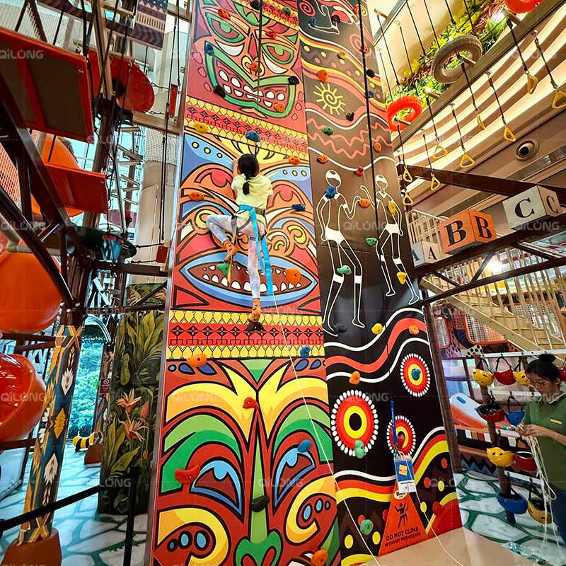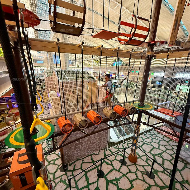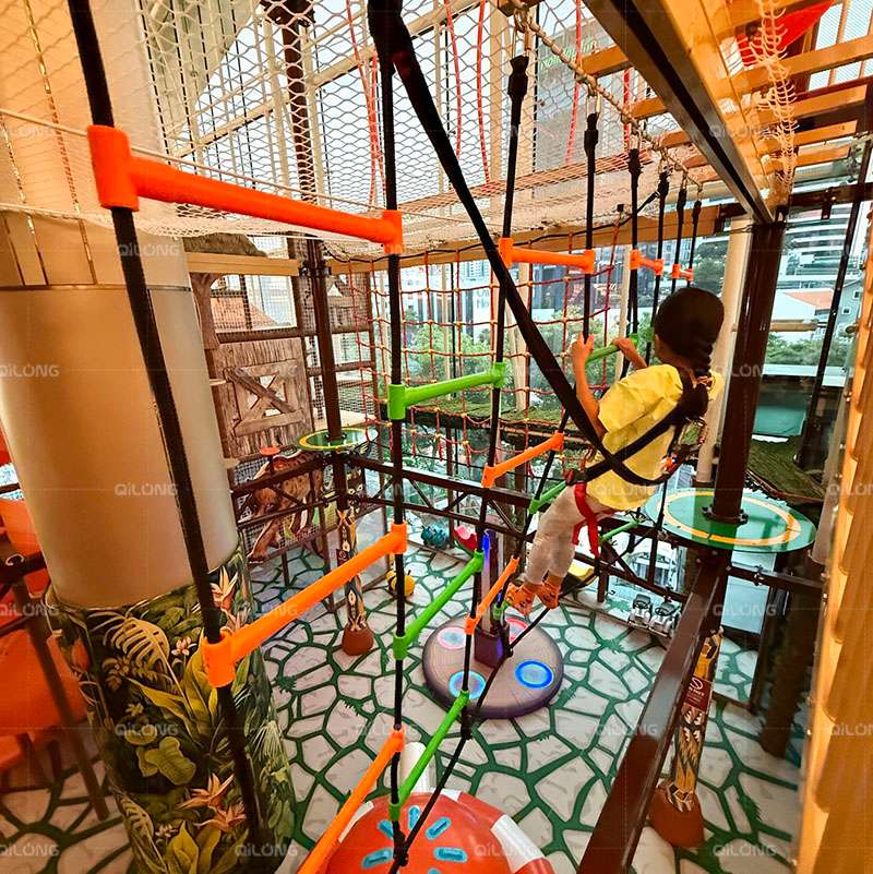 Cada centímetro está diseñado con cuidado: colchonetas suaves amortiguan las volteretas, arneses protegen a los niños que vuelan alto y desafíos adaptados a cada edad fomentan la confianza. Desde los vibrantes tonos de los motivos tribales hasta los exuberantes verdes de las escenas selváticas, la decoración envolvente transporta a los niños a tierras lejanas, convirtiendo el juego en una odisea mágica.