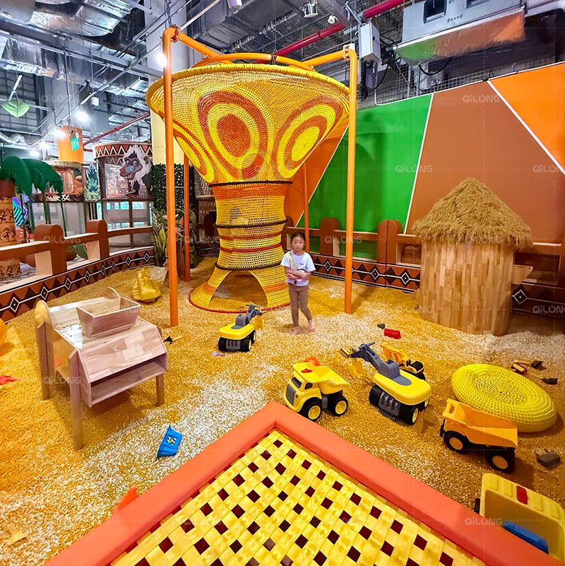 Esta zona está llena de arena e incluye una gran estructura tejida con forma de cesta. Hay numerosos camiones de juguete y vehículos de construcción dispersos, junto con una pequeña cabaña con techo de paja y muebles de madera, lo que fomenta el juego creativo y táctil.