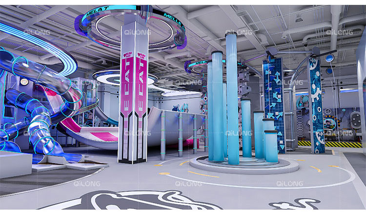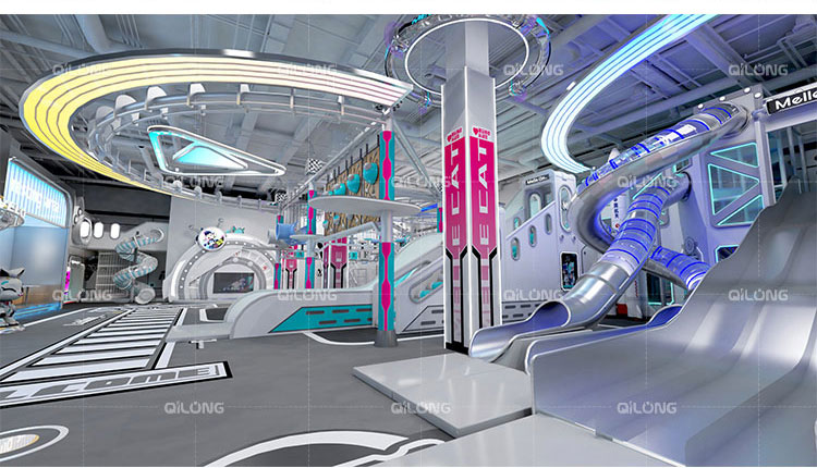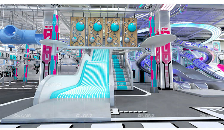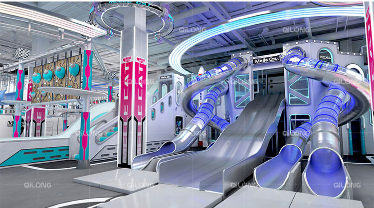The playground combines sleek metallic surfaces with vibrant neon accents, creating an immersive environment that captivates visitors of all ages. The illuminated elements work perfectly in both darkened environments and brightly lit spaces, making it ideal for shopping malls, amusement parks, and family entertainment centers.